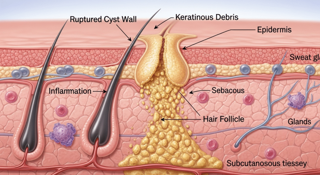 The massive lump was most likely a sebaceous/epidermoid cyst β a trapped pocket of oil and dead skin under the skinβs surface.
