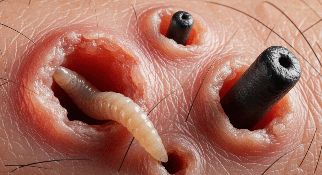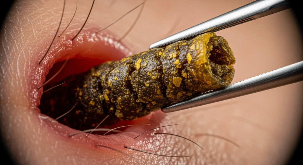 At first glance, this image looks unreal β small holes in the skin, metal tools, and hard yellowish plugs being pulled out one by one.