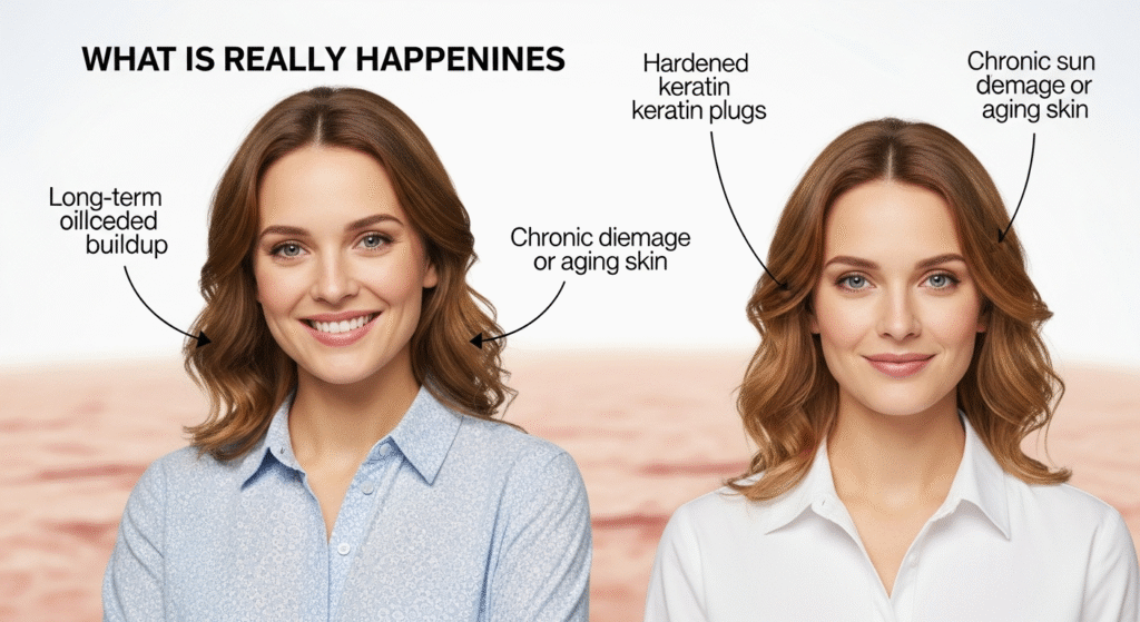 Over time, these pores expand and turn into deep, stone-like plugs trapped under the skin.