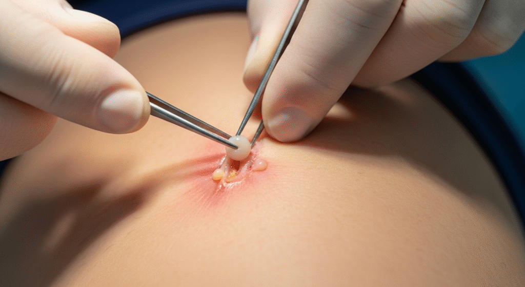 A shocking medical moment captured in this viral image shows doctors carefully removing a painful skin cyst from a highly sensitive body area. The swelling, redness, and visible pressure under the skin clearly indicate a serious infection building beneath the surface.