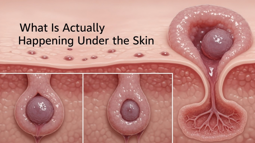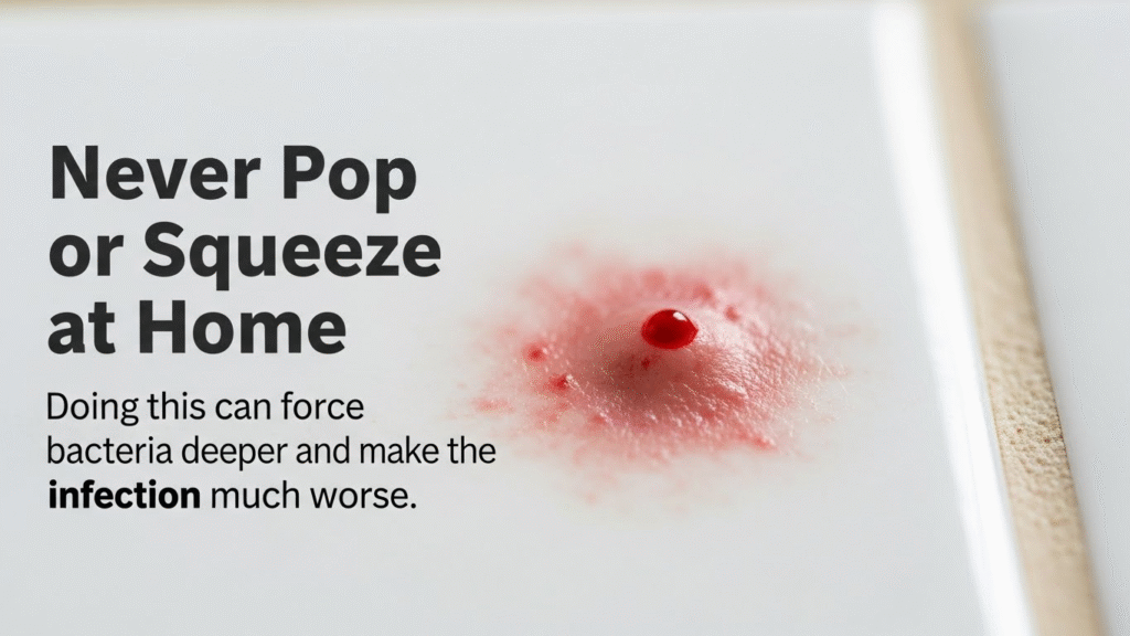 The image shows a severely infected abscess or cyst, a pocket of pus caused by bacteria trapped beneath the skin. Over time, the infection grows, pressure builds up, and the body tries to push it out β resulting in painful swelling and discharge.