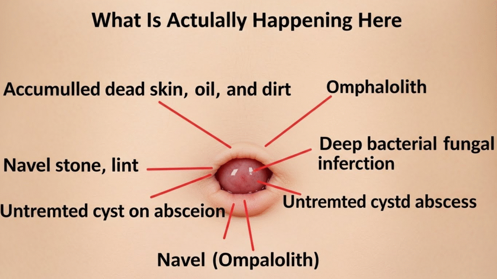 Over time, sweat, lint, and skin debris can harden inside the belly button, forming a solid mass that may become infected if not cleaned properly.