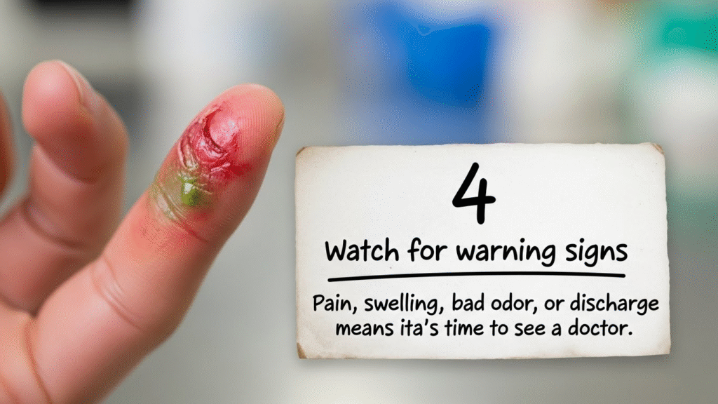 Pain, swelling, bad odor, or discharge means it’s time to see a doctor.