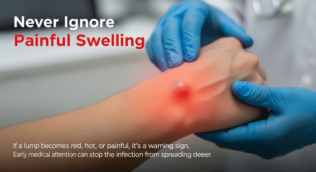 If a lump becomes red, hot, or painful, itβs a warning sign. Early medical attention can stop the infection from spreading deeper.