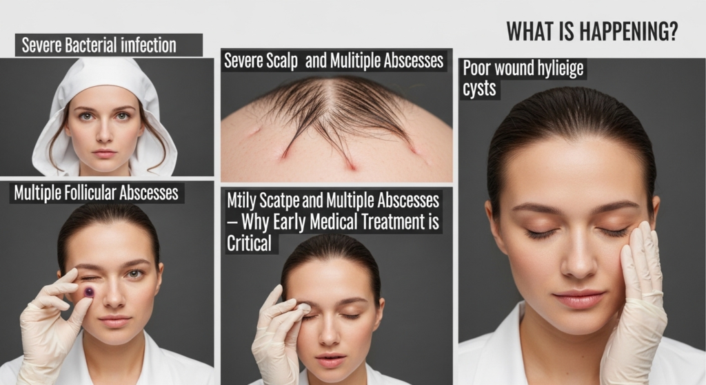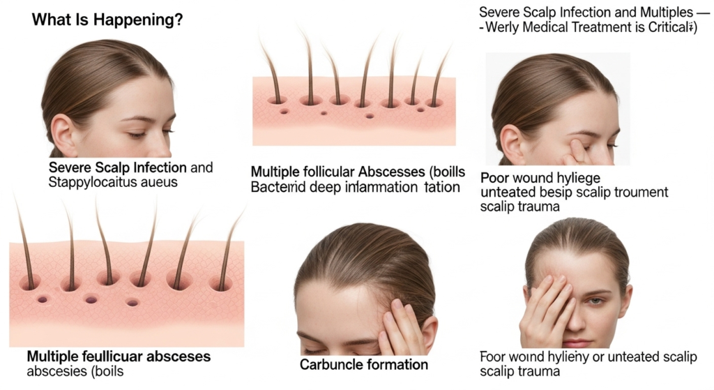 Skin infections on the scalp can quickly turn from minor irritation into a painful and potentially serious medical condition. The image above shows a severe case involving multiple inflamed lesions, swelling, and pus-filled abscesses across the back of the scalp — a condition that requires immediate medical evaluation.