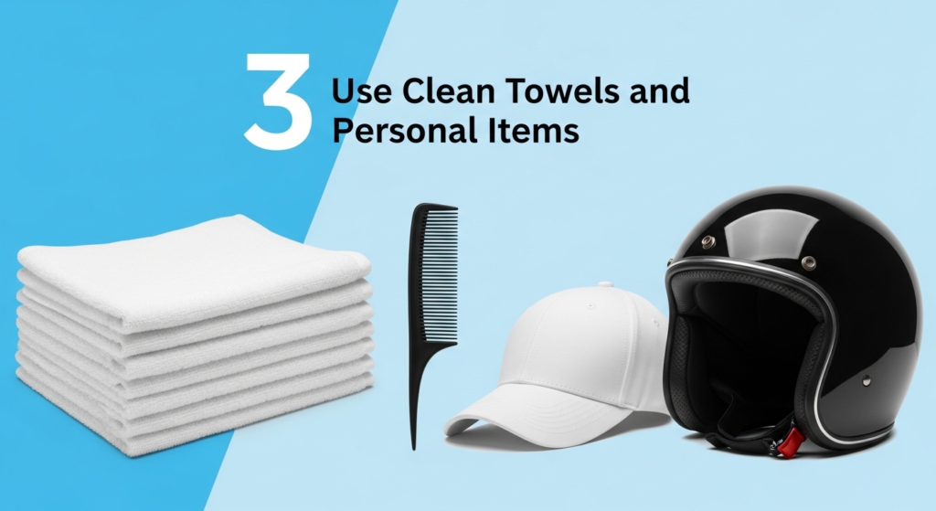 Never share combs, caps, helmets, or towels. Bacterial infections can spread easily through contaminated personal items.