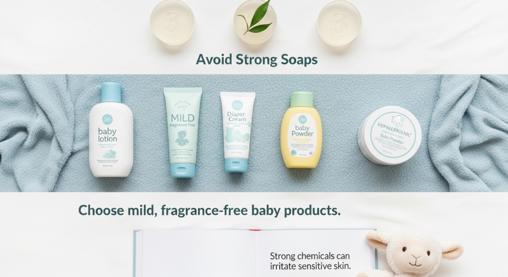 Choose mild, fragrance-free baby products. Strong chemicals can irritate sensitive skin.