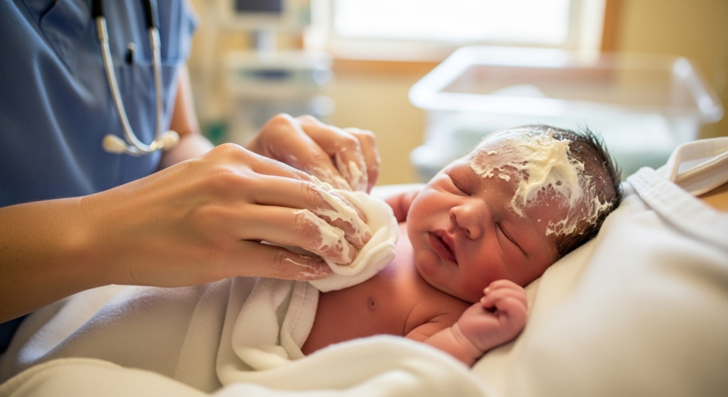A touching image of a newborn baby is going viral online. In the photo, a healthcare professional is gently wiping a thick, creamy white layer from the baby’s back just moments after birth.