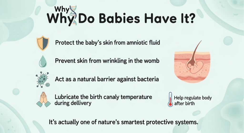 It is a natural, protective substance that forms on a baby’s skin during pregnancy.