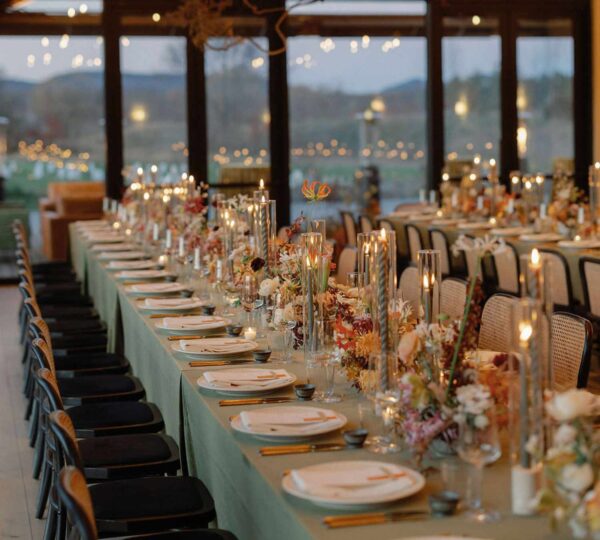 Long banquet tables were adorned with bouquets of wildflowers, tall taper candles flickering softly, and delicate lace runners that matched the bride’s gown.