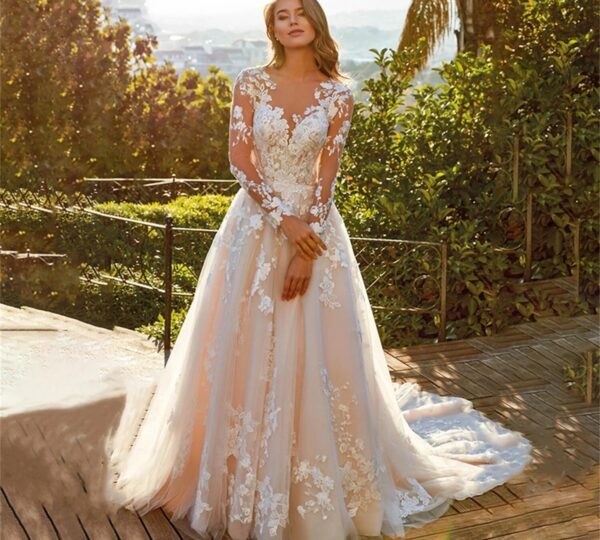 Her long train trailed gracefully behind her, each fold of fabric flowing like liquid silk, while her veil, light as a whisper, fluttered gently with each step through the open French doors.