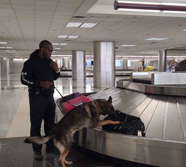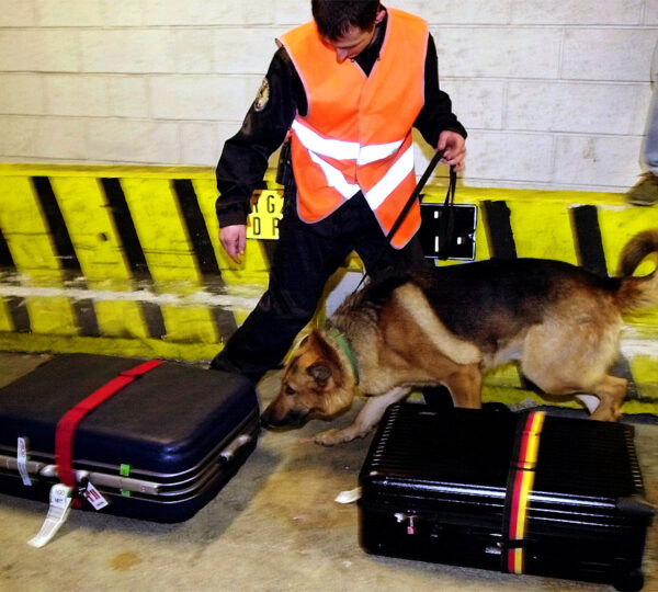 A typical K9 team consists of a handler and a dog. The dog’s duties include sniffing luggage, cargo, and occasionally passengers, while the handler interprets the dog’s behavior.