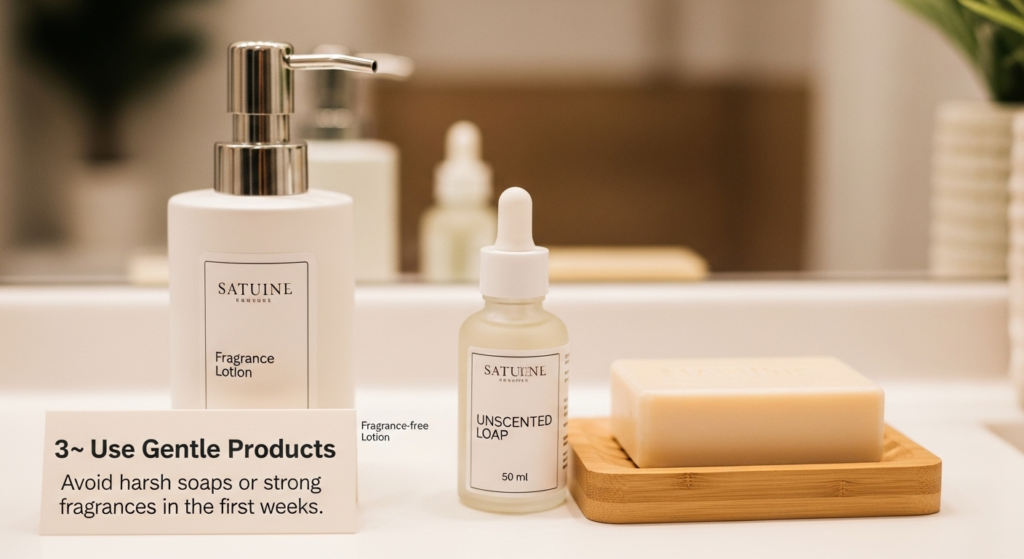 Avoid harsh soaps or strong fragrances in the first weeks.