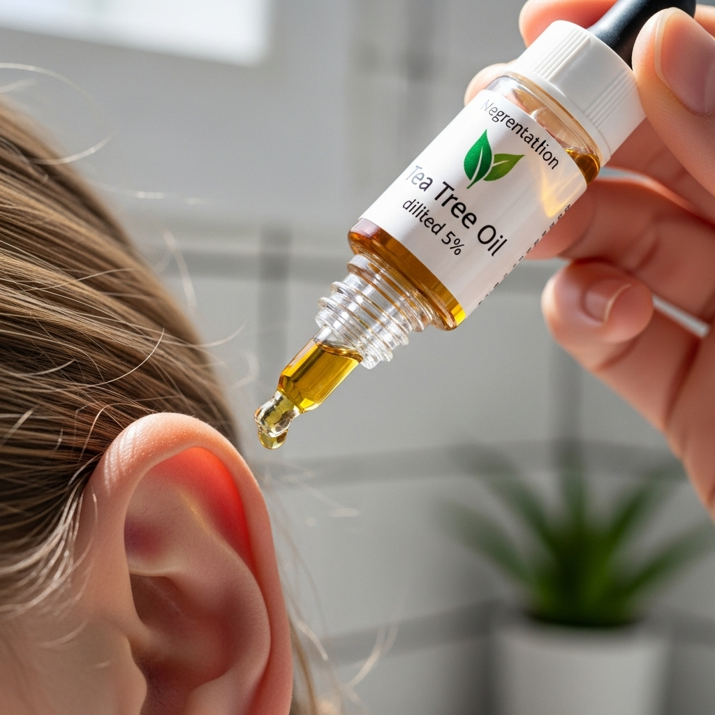 Tea tree oil is antibacterial. Mix a few drops with coconut oil and apply gently — never use it directly, as it’s strong.