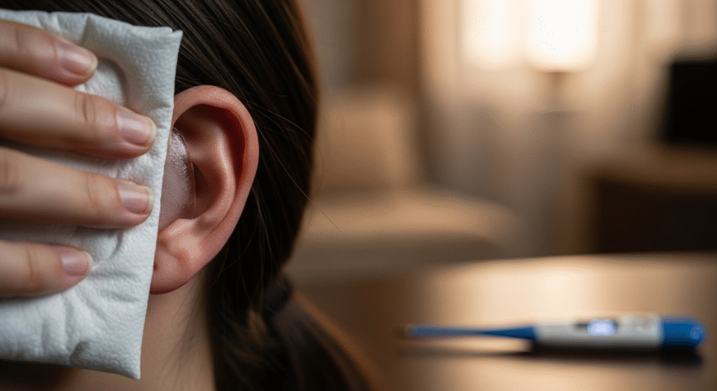 Hold a warm (not hot) cloth against the affected ear for 5–10 minutes. It helps reduce swelling, pain, and helps pus drain out smoothly.