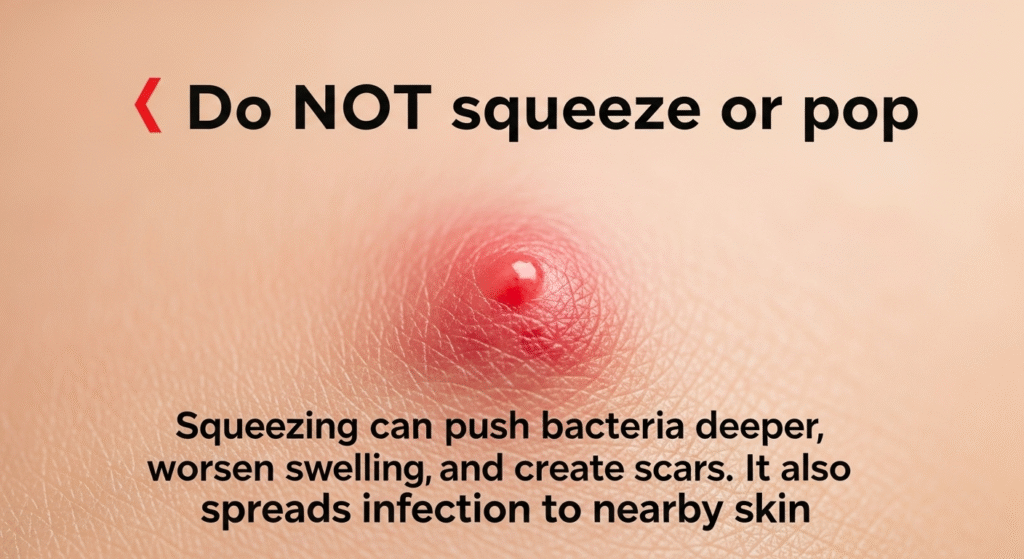 Squeezing can push bacteria deeper, worsen swelling, and create scars.